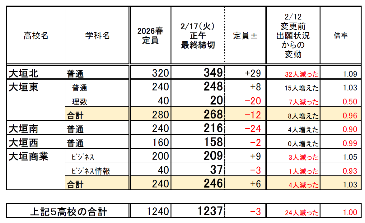 2026年2月17日に岐阜県公立高校入試の出願変更は締め切られた。