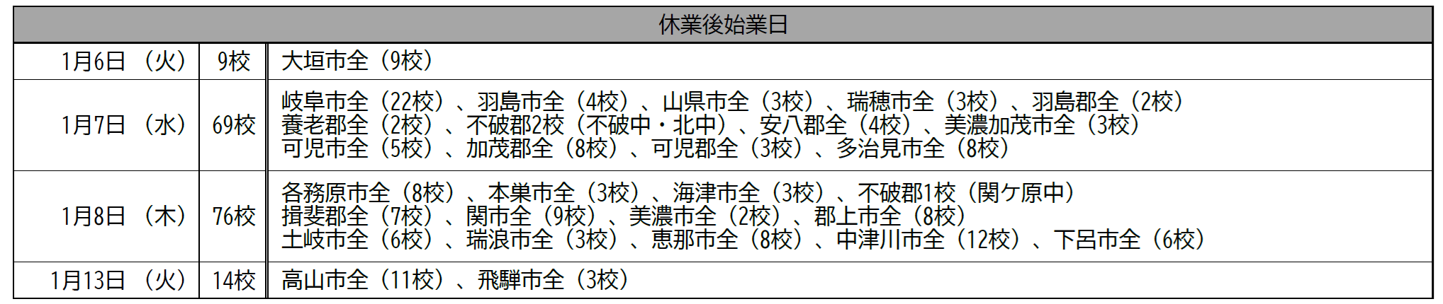 大垣市は今まで県内で最も早く冬休みが終わっていた。