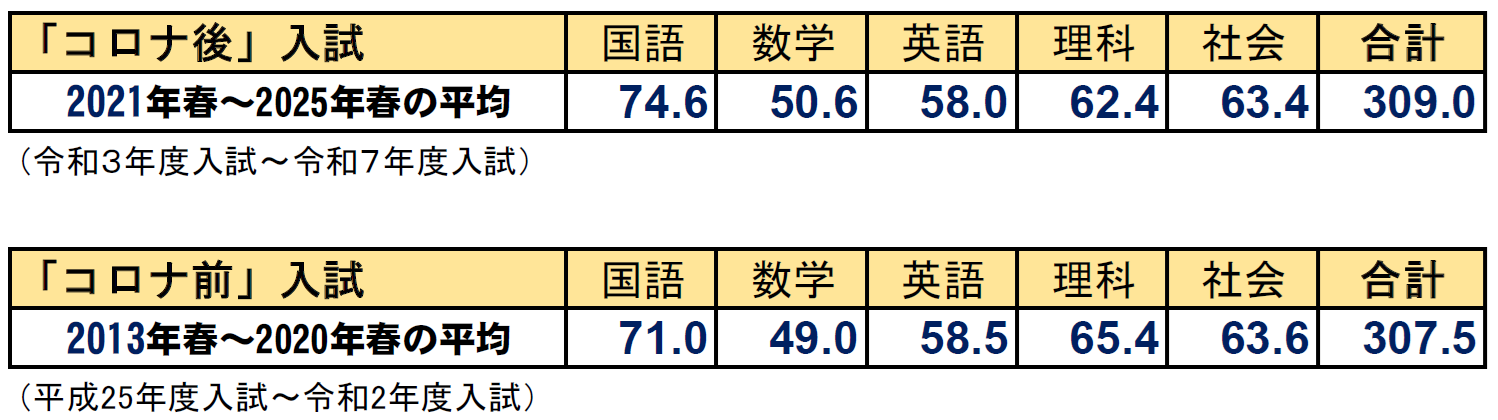 現行制度下全体の話はあちらのページに任せておいて、ここではこの前区切った「コロナ前」入試(2013年春~2020年春)と「コロナ後」入試(2021年春~2025年春)で分けて出した平均点について書く。