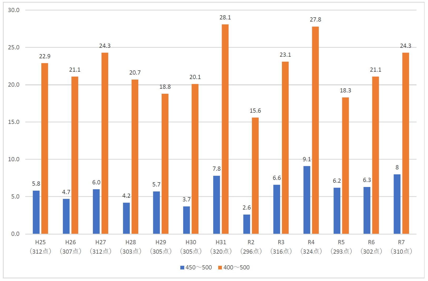 最近5年間(2021年春~2025年春)の450点以上の割合の平均は7%を超える。