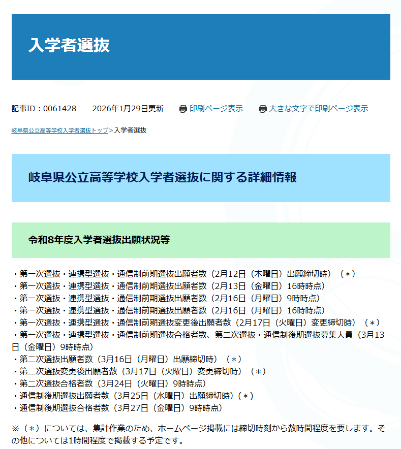 例年この時期に2月の出願締切(変更前)、変更期間、最終締切の出願状況の発表スケジュールについて県教委は入学者選抜のページに出している。